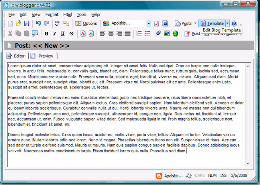 I found the layout of w.bloggar to be quite limited. You have two views available, the Editor tab and the Preview tab. The fact that it does not have a WYSIWYG editor bothered me and its Editor displays the HTML tags when you format text, plus there is no option to enable inline spell check either.